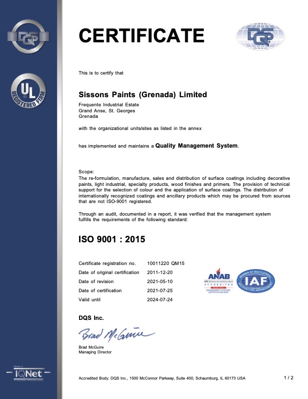 Sissons Paints opened its doors in Grenada in August 1986 with a staff of 12. It’s one of a few manufacturing and exporting companies in Grenada and has grown in staff and physical facilities, expanded its product line and improved its profitability. Sissons Paints has set the pace for product development in the Caribbean. The group of companies offers a wide variety of decorative and protective coatings: these include light and heavy industrial coatings furniture finishes and marine paints.